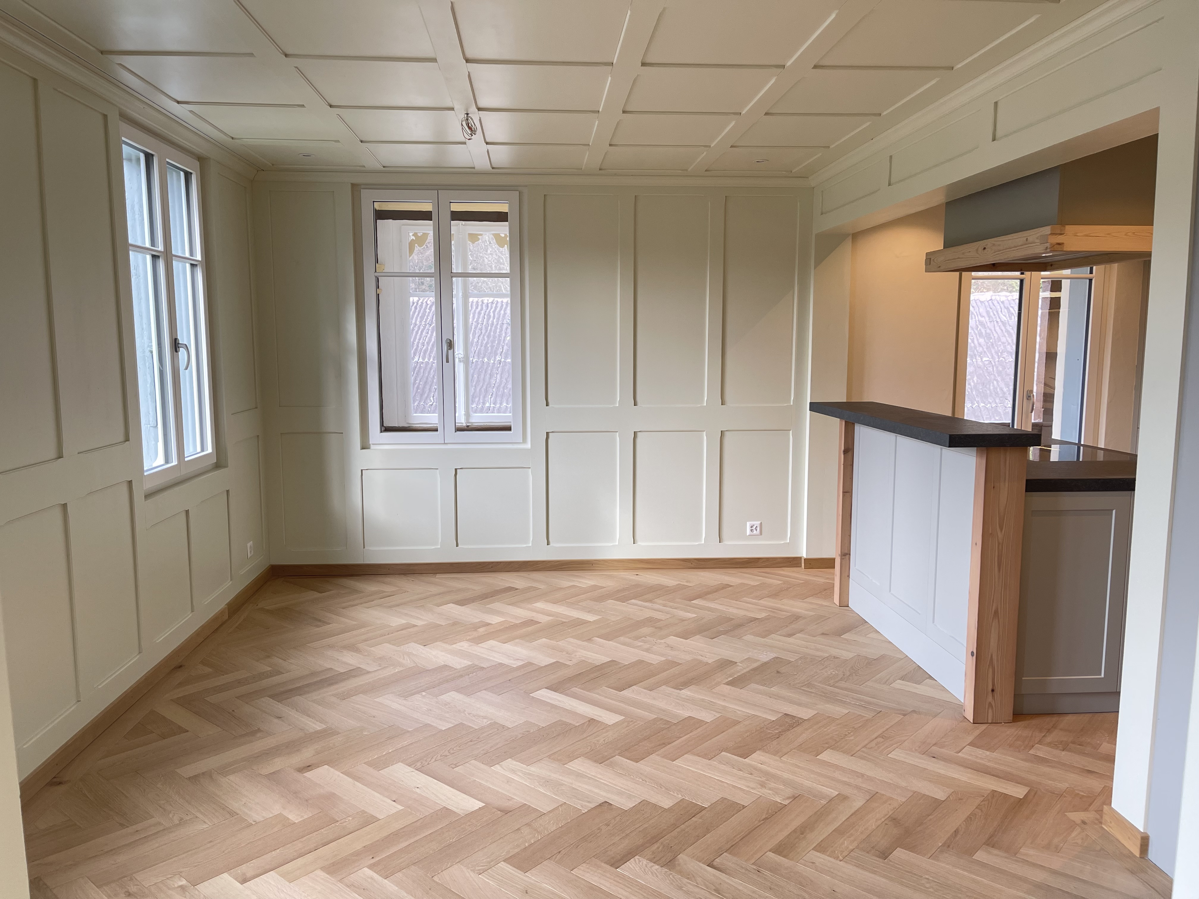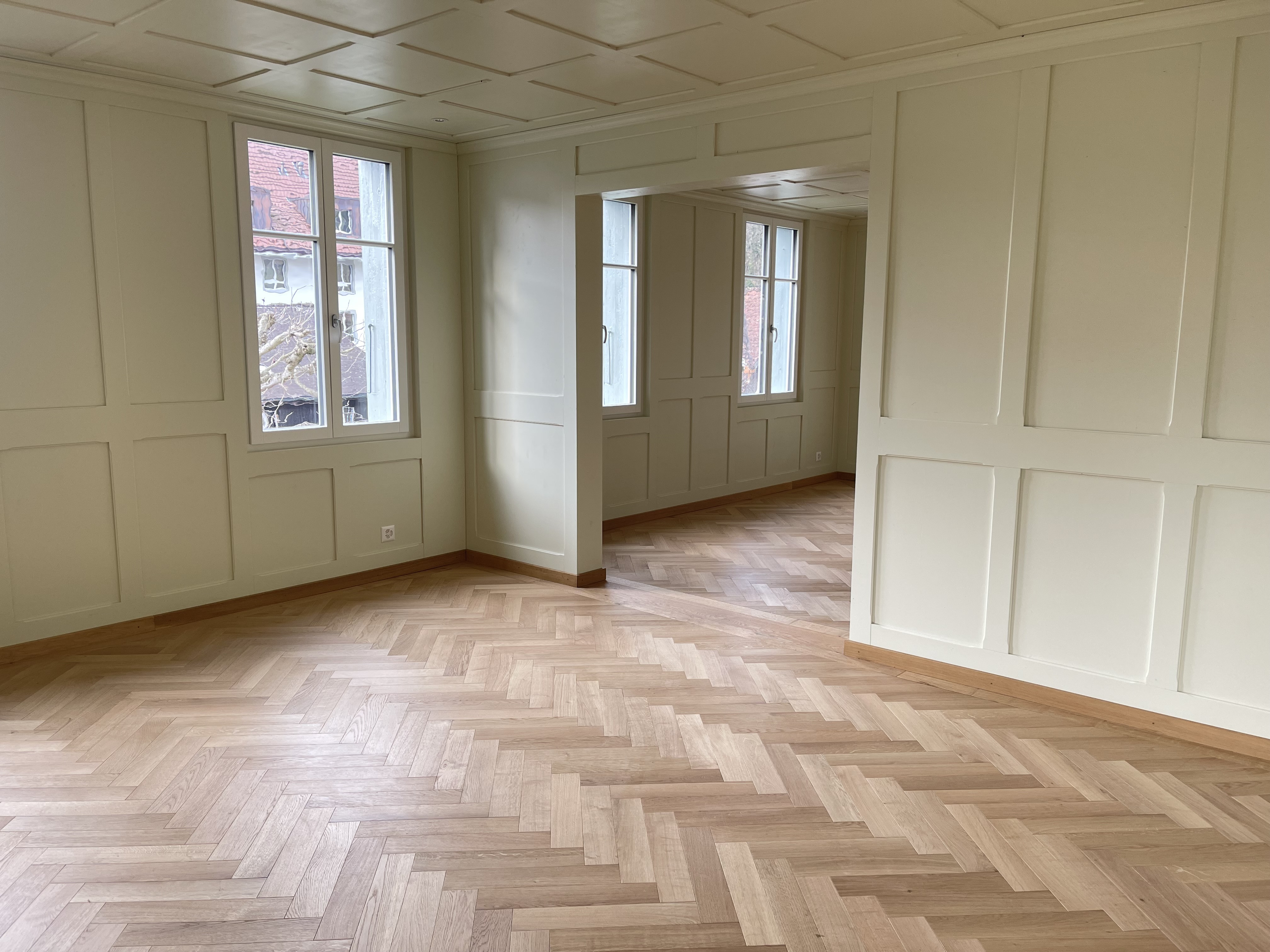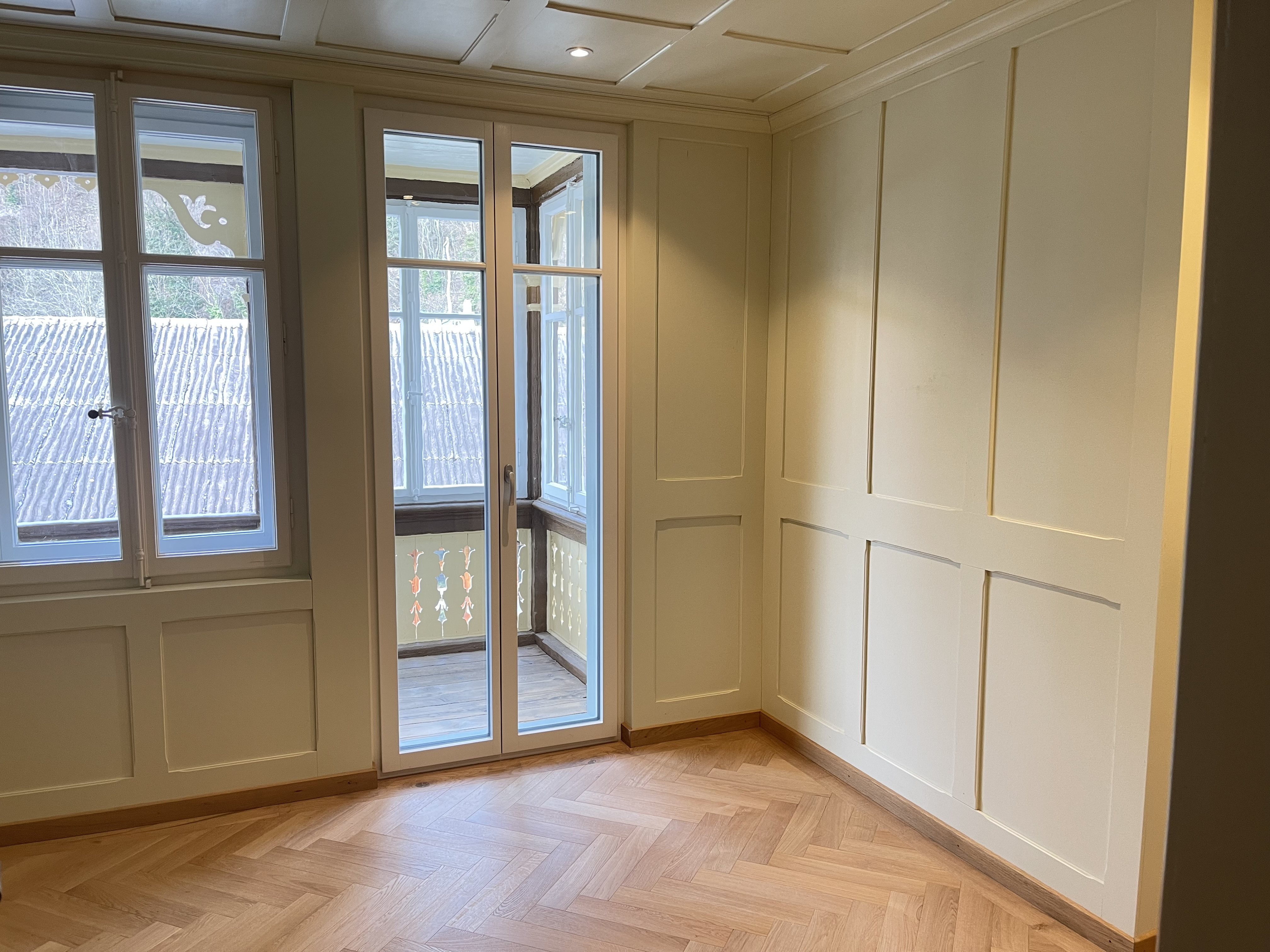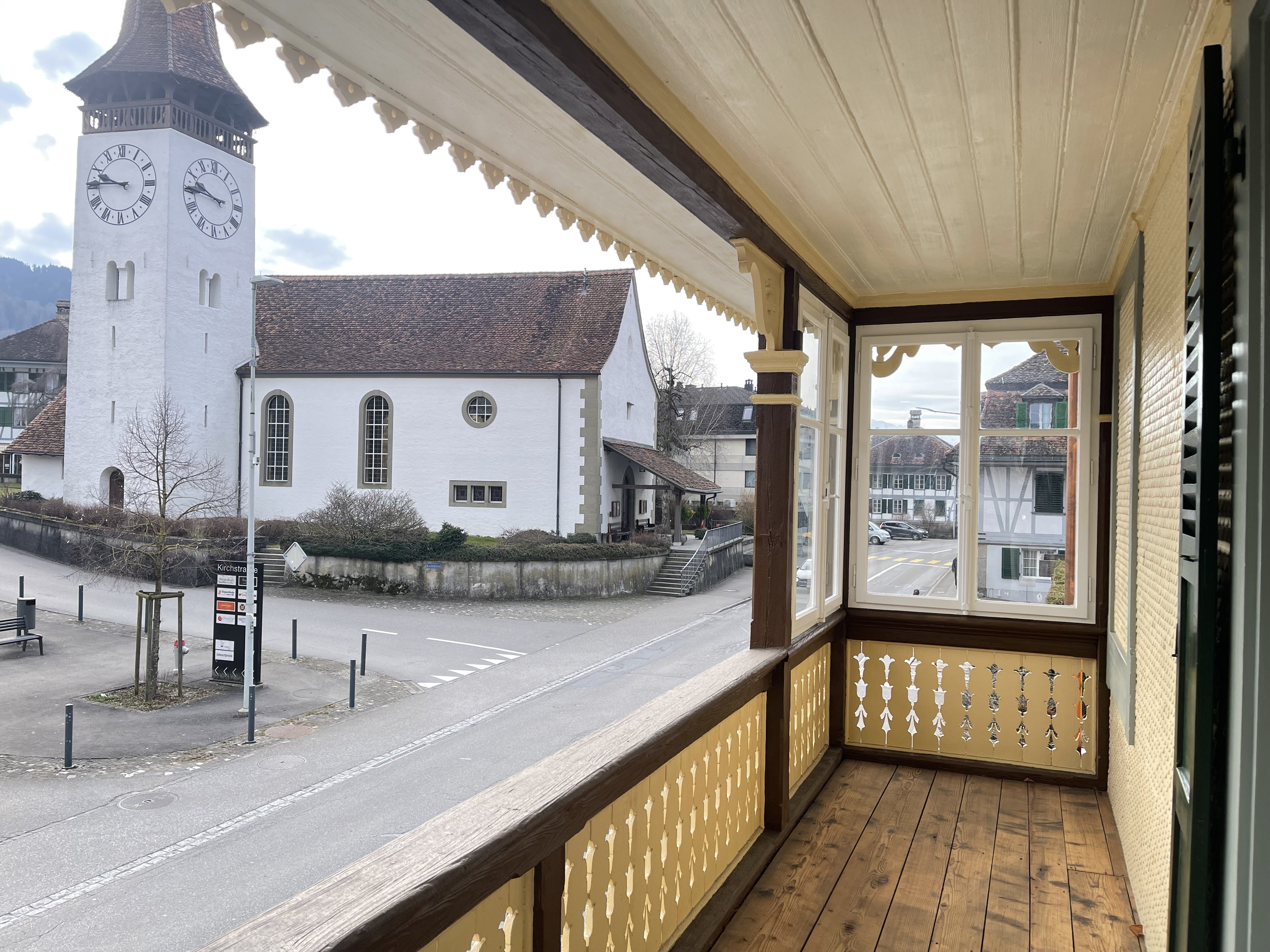 In the centre of Oberdiessbach, this stylishly renovated 4.5-room apartment with 117 m² of living space awaits you. The apartment combines historic charm with modern comfort and offers a unique living experience through balconies on multiple sides.