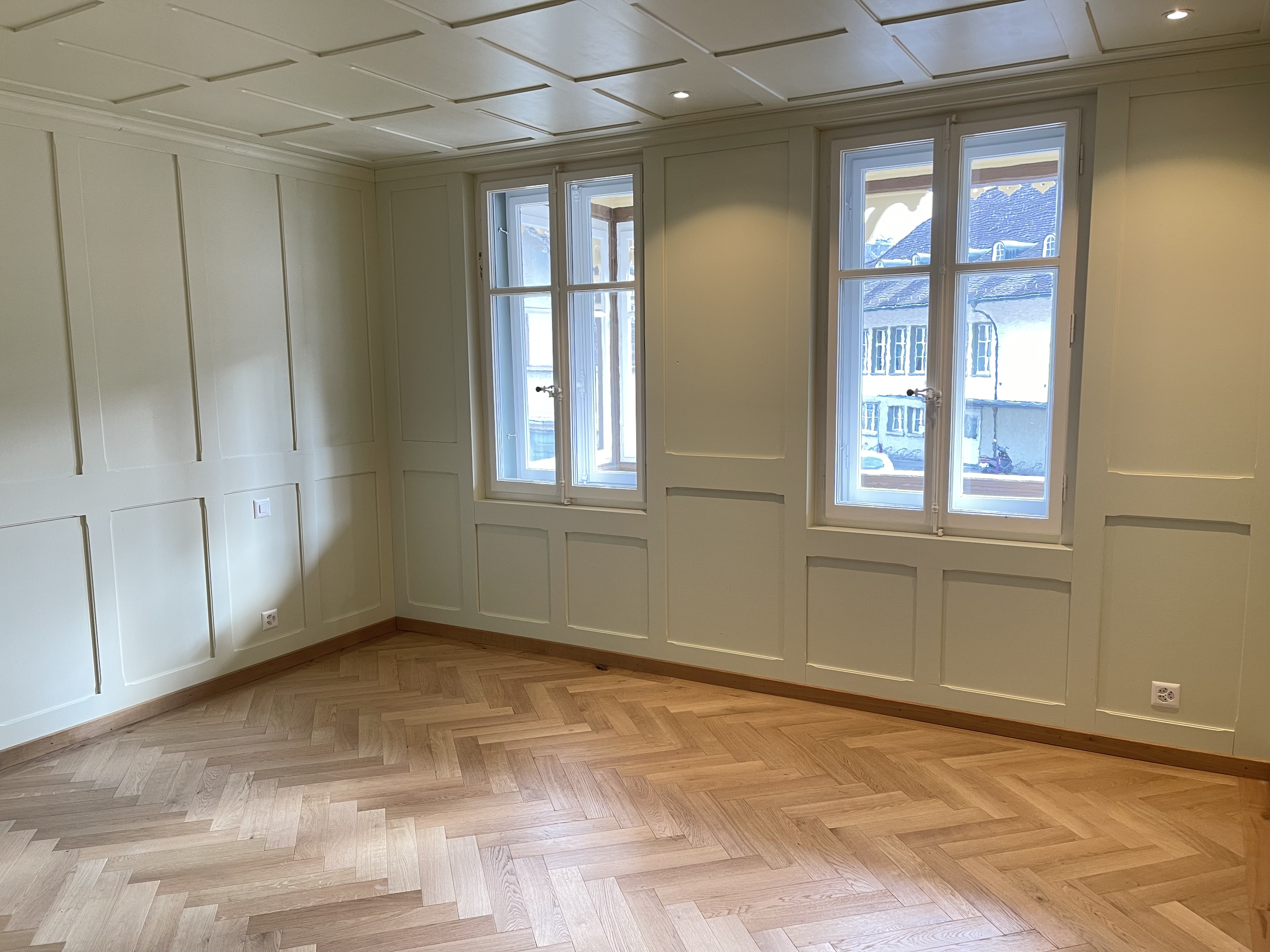 The generous, light-filled rooms impress with high-quality herringbone parquet, classic wall panelling, and an elegant coffered ceiling. Multiple window fronts ensure a bright and friendly atmosphere.
